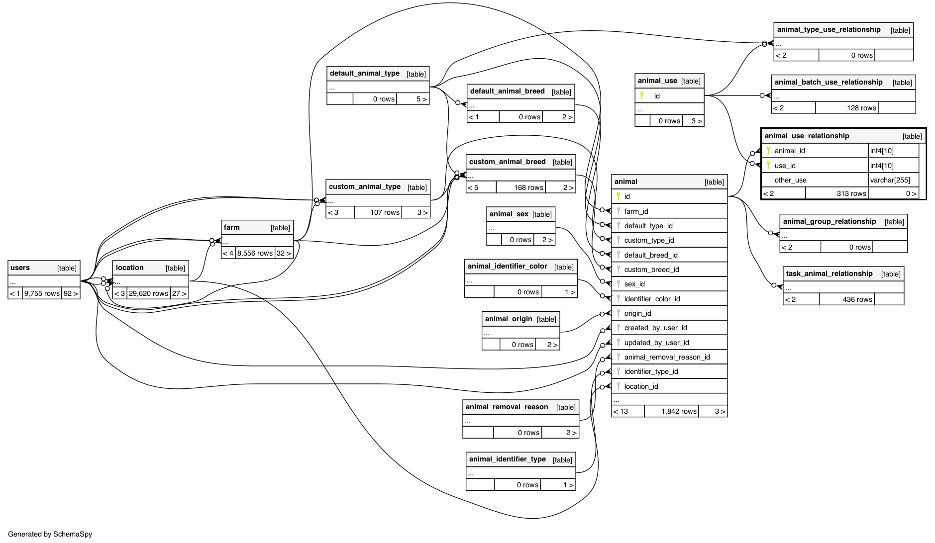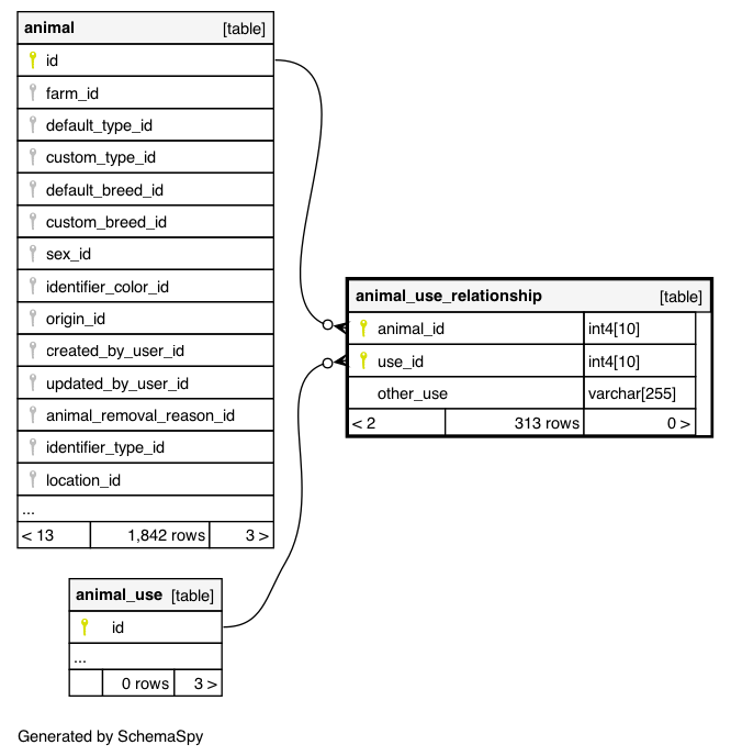 | animal_use_relationship_pkey | Primary key | Asc/Asc | animal_id + use_id |