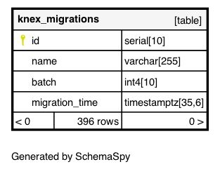 | id | serial | 10 | √ | nextval('knex_migrations_id_seq'::regclass) |